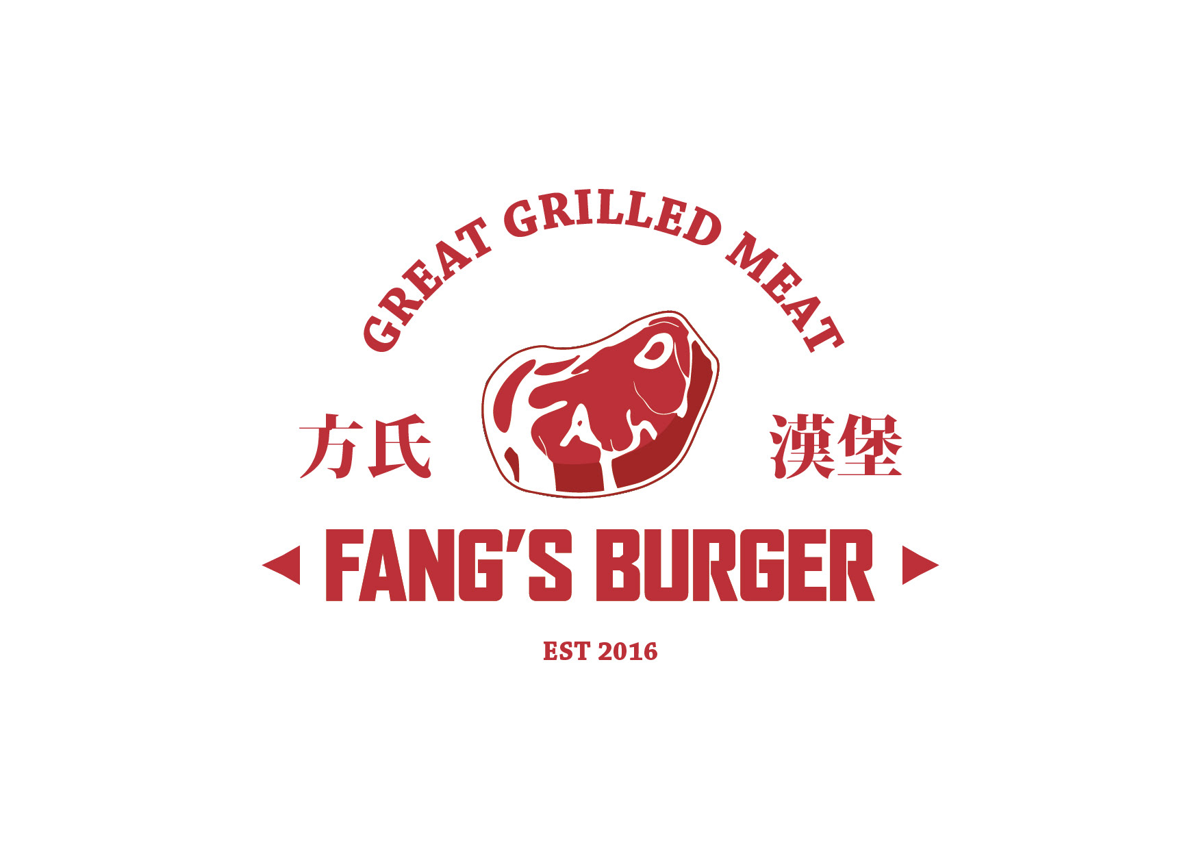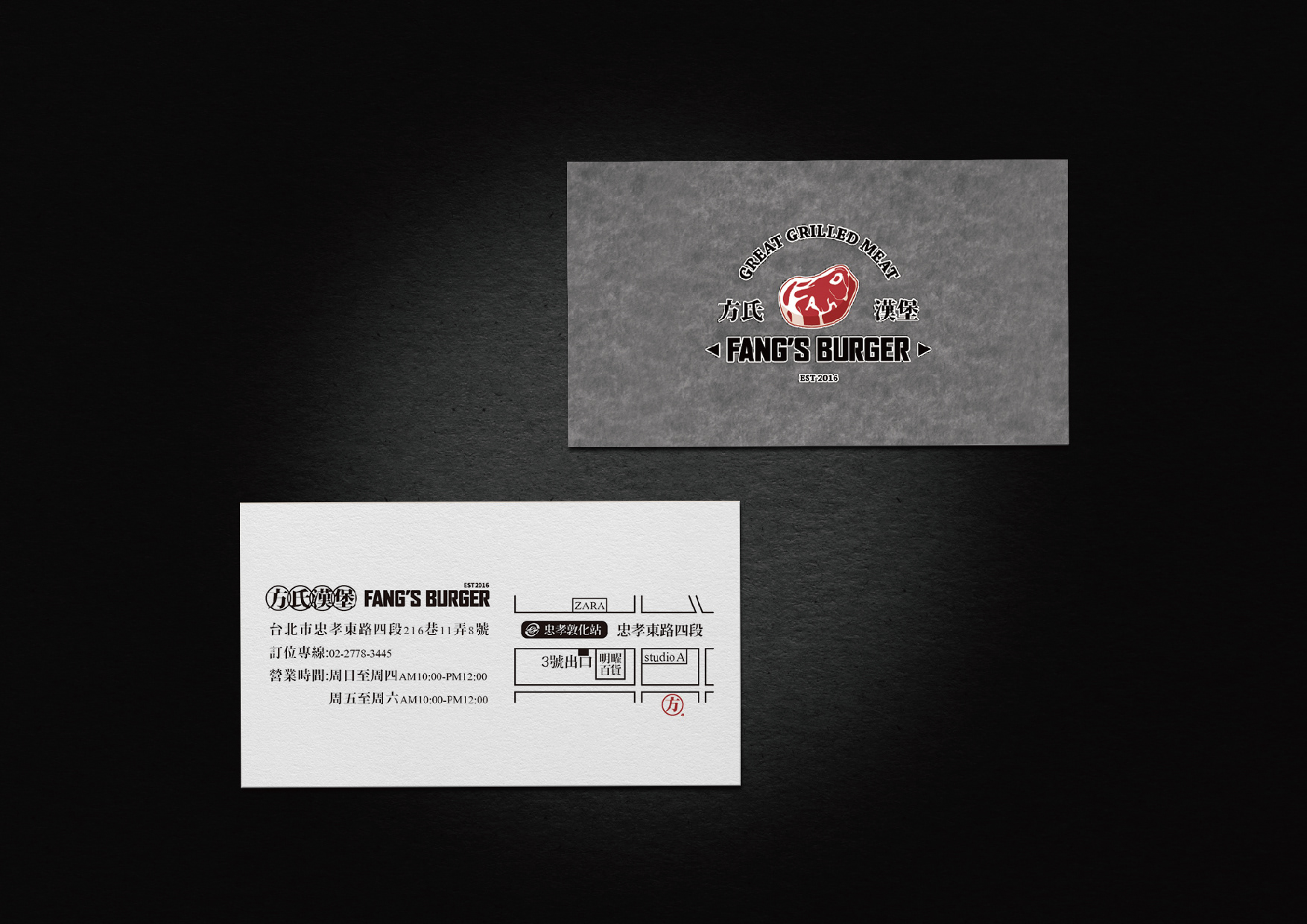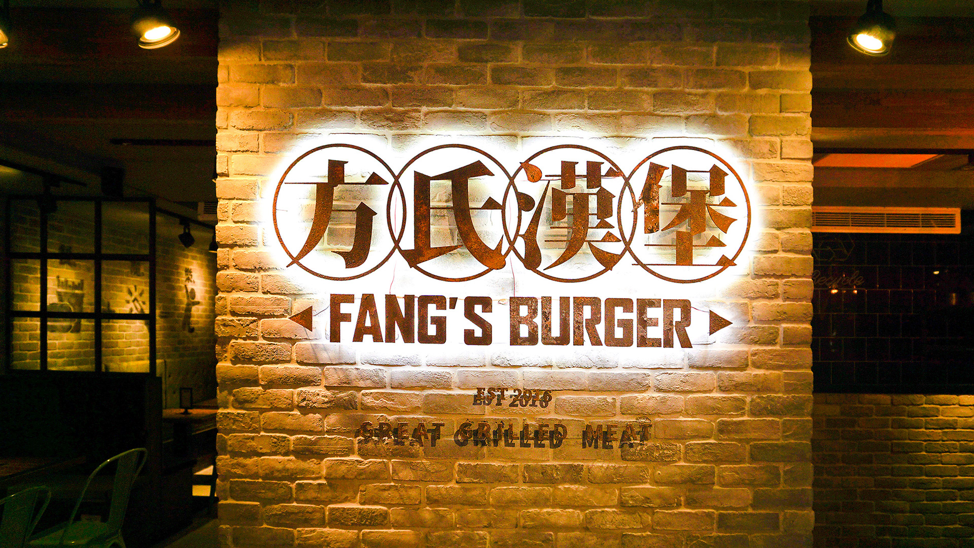 一家位於台北市的工業風格美式漢堡店,供應多樣特殊選擇性的口味手工牛肉漢堡為著稱。當今漢堡類型的餐廳,多以美式風格來呈現,我們為了創造出不同的識別度,將中西文化合併,整個視覺上帶入了漢字的元素。在商標部分,因該店強調手工牛肉漢堡,提倡著是新鮮現做的漢堡肉,因此以『肉』這個概念直接帶入進商標主是覺,並且利用小巧思,將該店創始人姓氏『方』的英文拼音Fang變成了油花 ,讓許多觀察細為的客人,查覺到的時候有意外的驚喜。