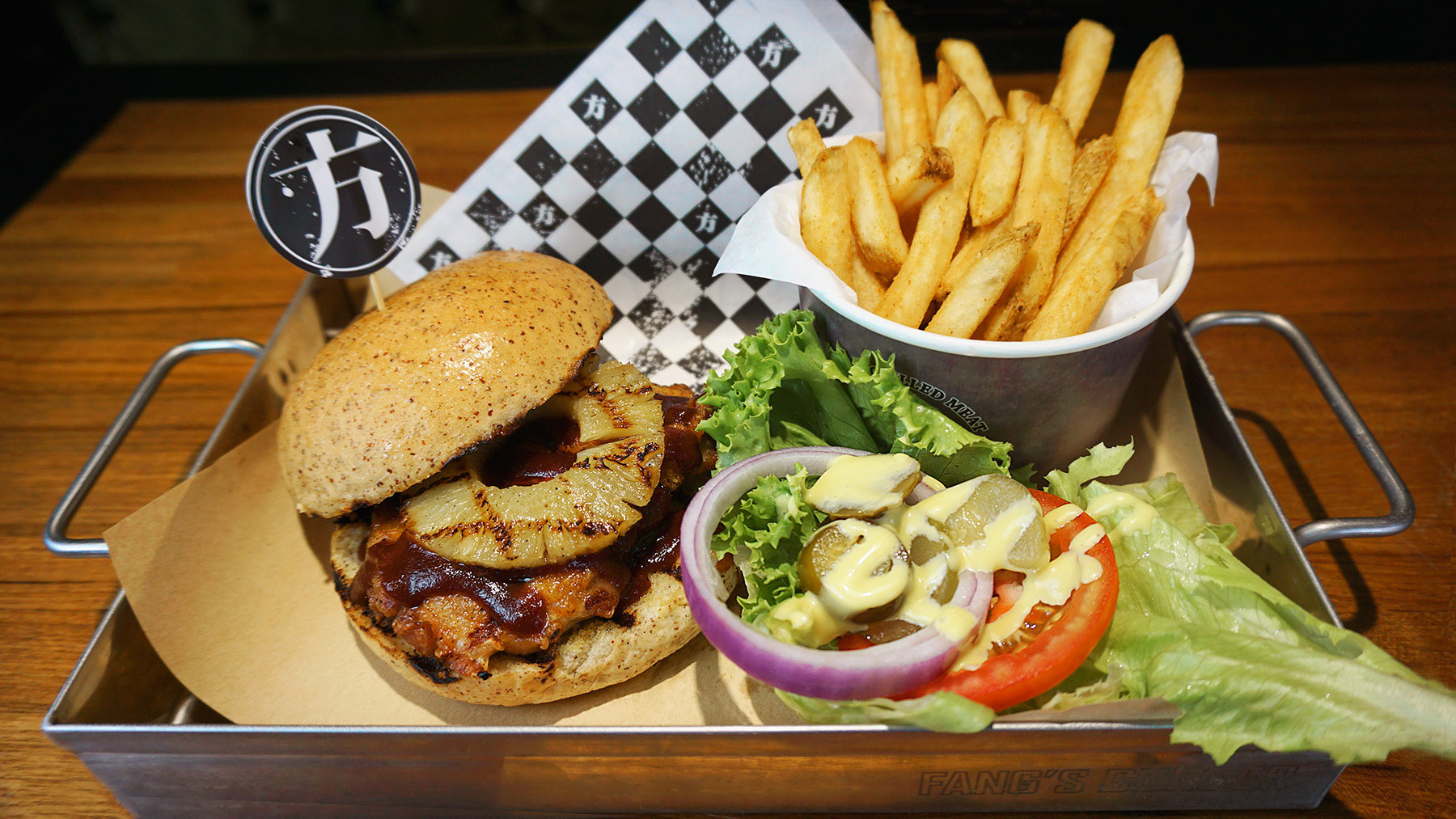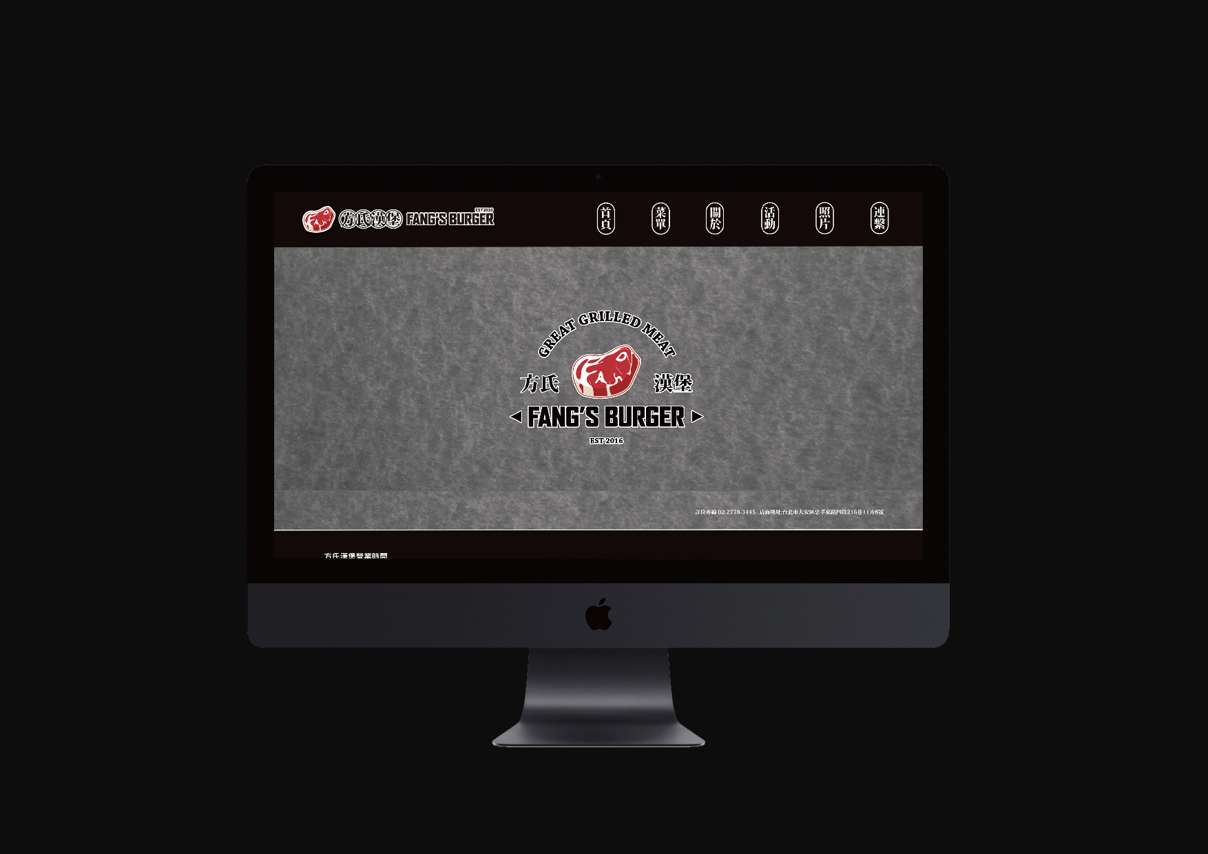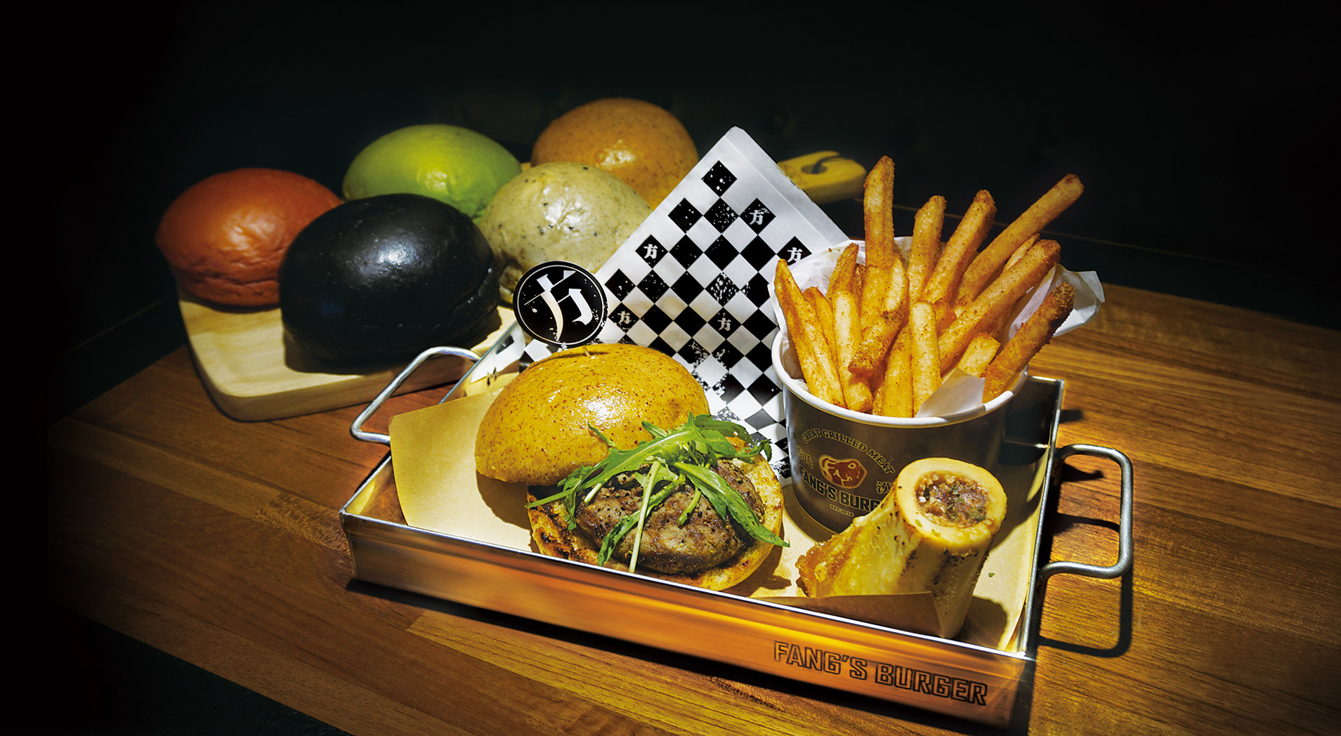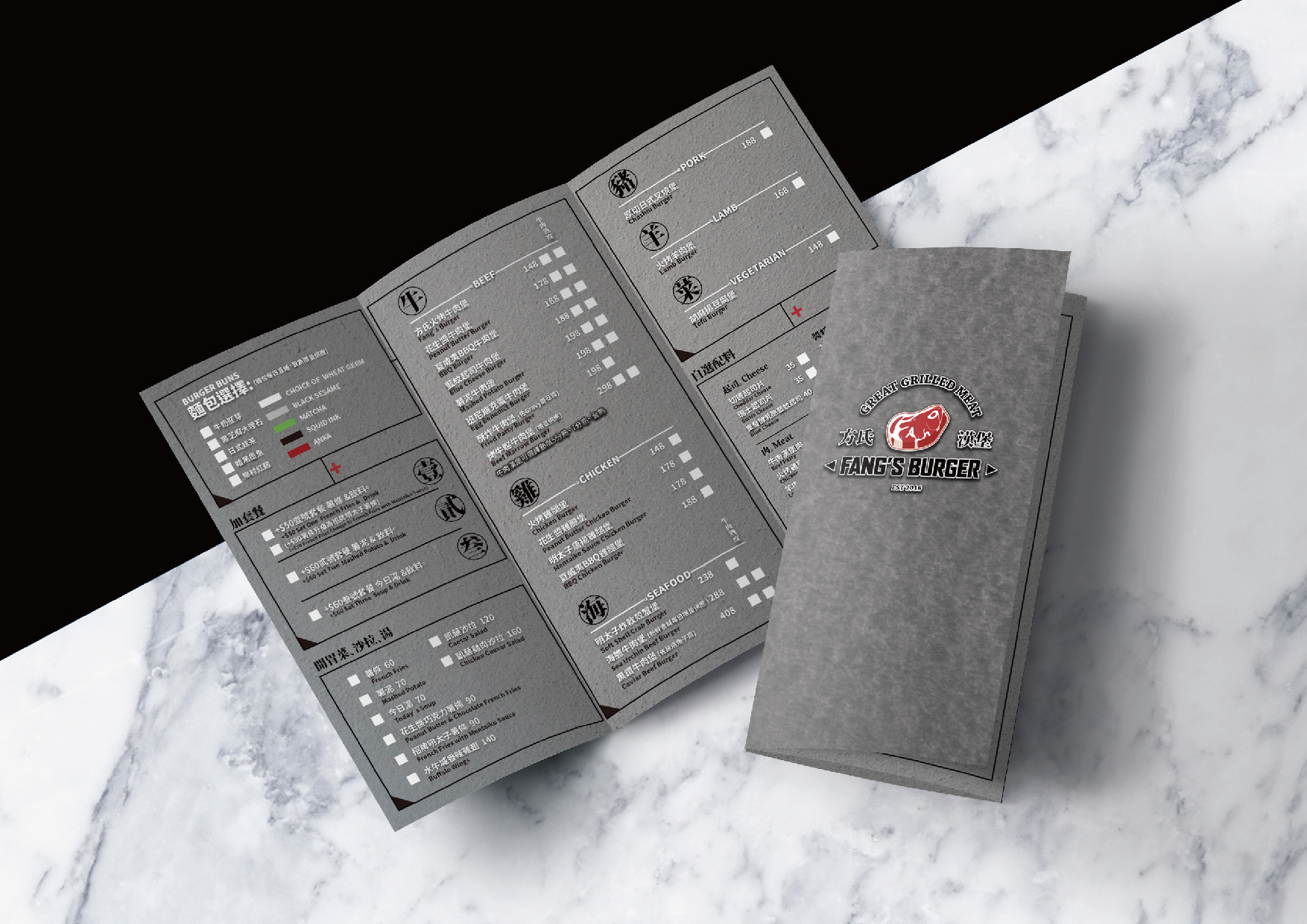 一家位於台北市的工業風格美式漢堡店,供應多樣特殊選擇性的口味手工牛肉漢堡為著稱。當今漢堡類型的餐廳,多以美式風格來呈現,我們為了創造出不同的識別度,將中西文化合併,整個視覺上帶入了漢字的元素。在商標部分,因該店強調手工牛肉漢堡,提倡著是新鮮現做的漢堡肉,因此以『肉』這個概念直接帶入進商標主是覺,並且利用小巧思,將該店創始人姓氏『方』的英文拼音Fang變成了油花 ,讓許多觀察細為的客人,查覺到的時候有意外的驚喜。