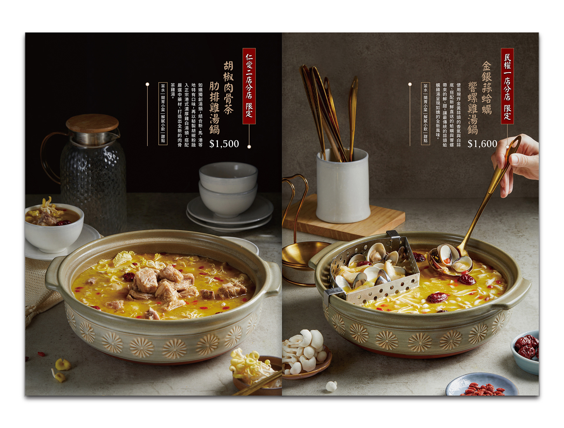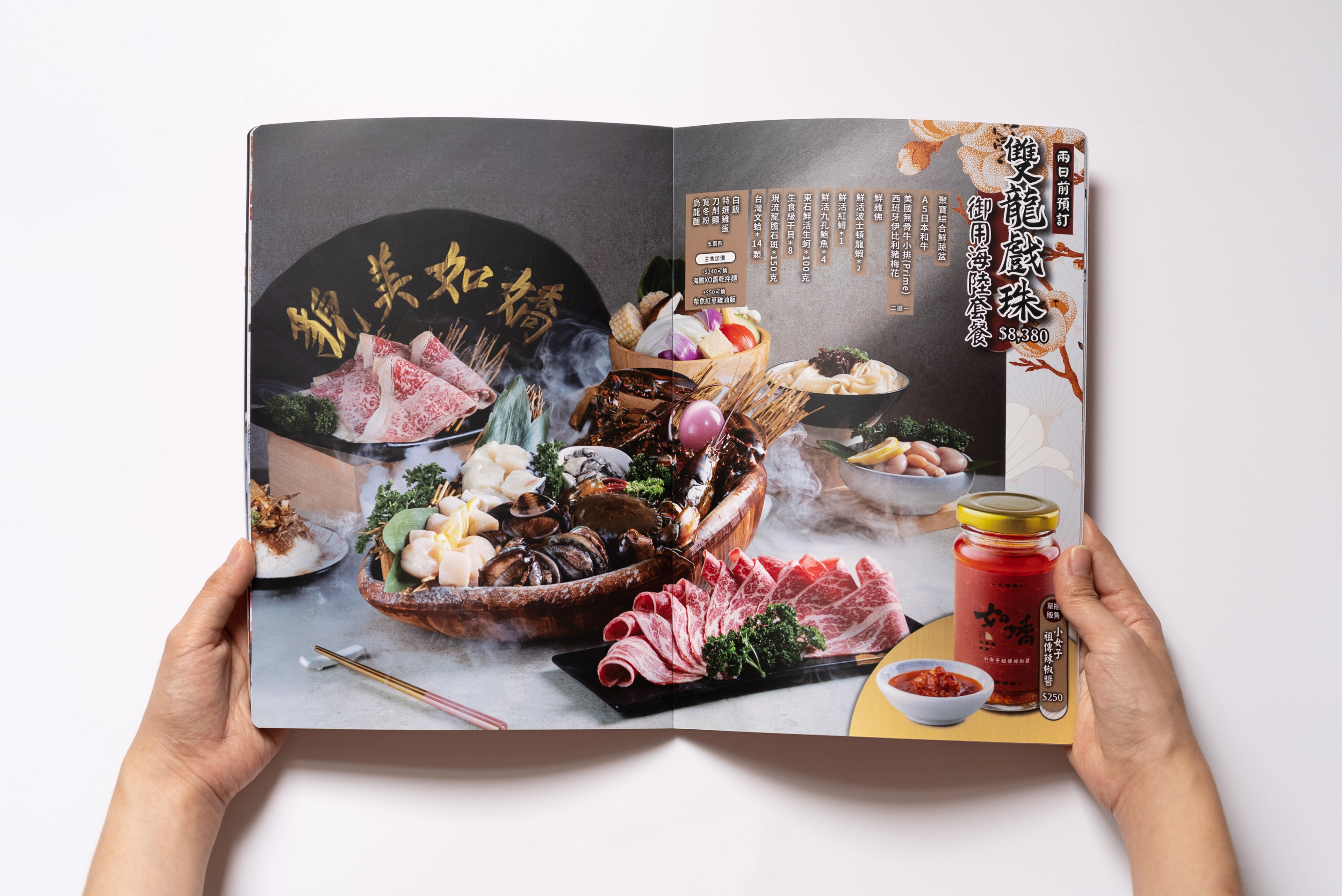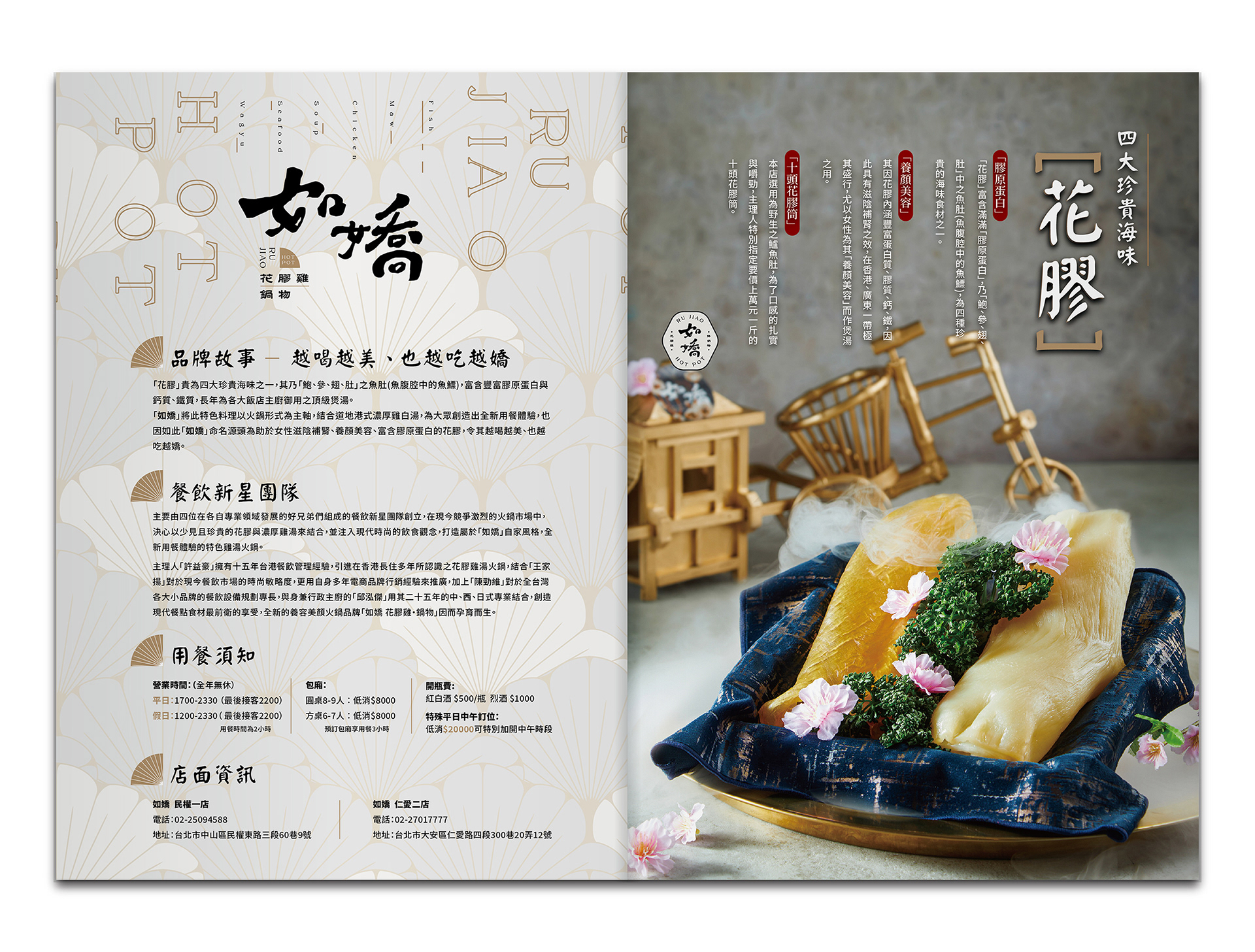 如嬌花膠雞鍋物以其獨特的花膠雞湯聞名,用餐環境明亮清新富現代感。品牌以細緻典雅的中式圖案與粉色調為主,配上紮實的中式書法與黑體字體。因此攝影風格用上乾淨的光線與影間,配合金銅器食具和陶瓷擺盤,去為食材凸顯其奢華質感、溫度層次與選擇的多樣性。